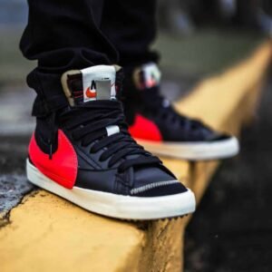 The Blazer Mid 77 Vintage White Black features a smooth white leather upper with grey suede mudguards and black Swooshes. A white sole and classic branded woven tongue label complete the design.