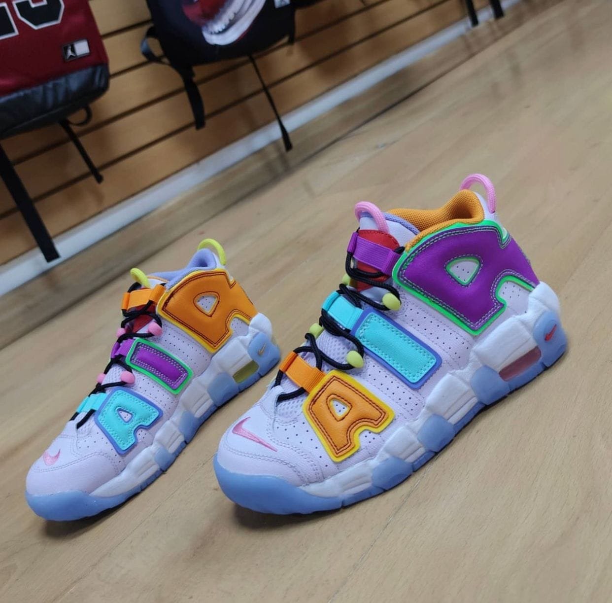 This Uptempo has a special meaning as well as a nice appearance. Whilst we’re currently unsure who to credit the message to, we still love the pair just as much thanks to its pleasing colour palette and subtle hues. The Uptempo silhouette has a translucent gridded upper that allows us to see the effect underneath. The instantly recognisable ‘AIR’ panelling is outlined, matching to the Branded branding at the top of the tongue, whilst mini-Swooshes in can be seen on the midsole and toe.