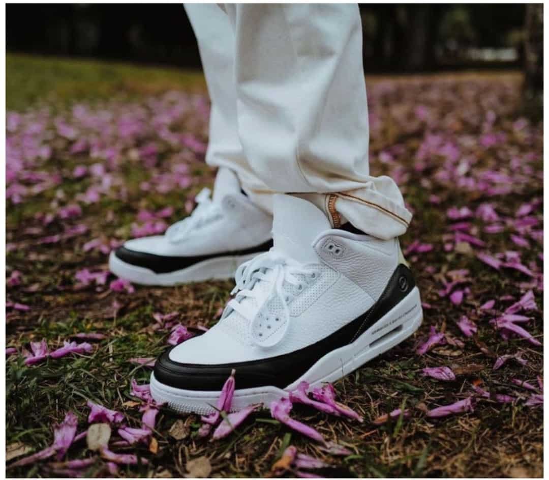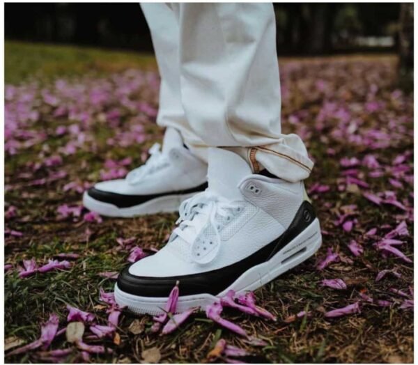 The Air Branded 3 Retro for grade-schoolers, nicknamed. The shoe has a white leather upper with the heel and forefoot overlays. The perforated leather collar, the polyurethane midsole, molded eyelets, the tongue embroidered with the Jumpman logo, and the heel tab embossed with the Branded Air logo all sum up the iconic features.