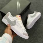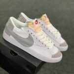 The Blazer Mid 77 Vintage White Sky features a smooth white leather upper with grey suede mudguards and black Swooshes. A white sole and classic branded woven tongue label complete the design.