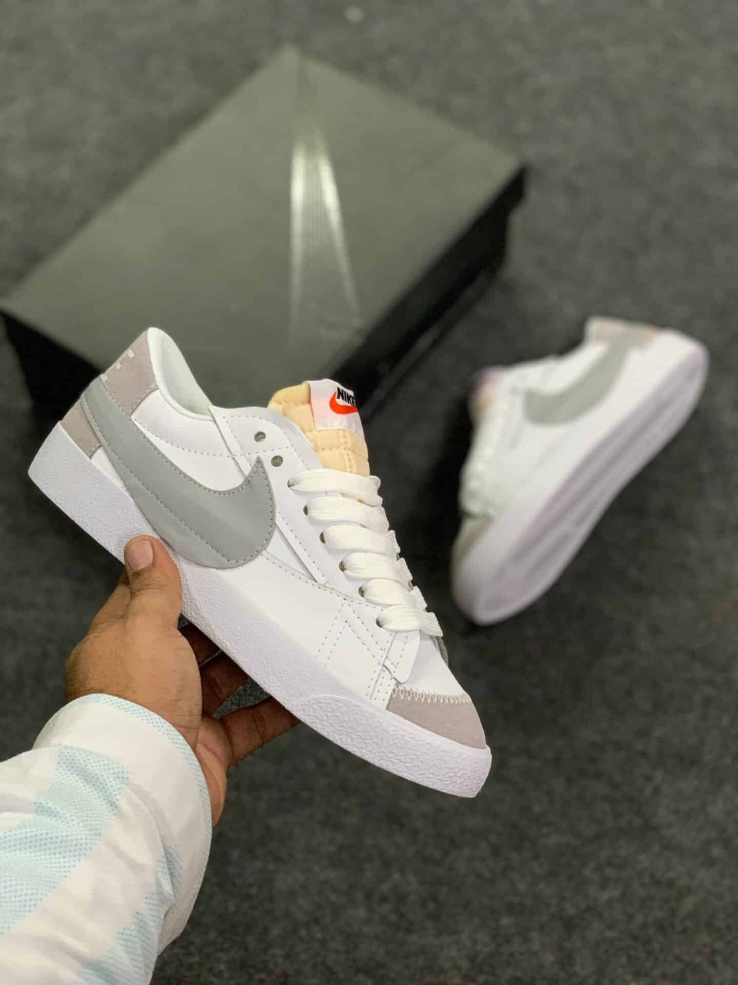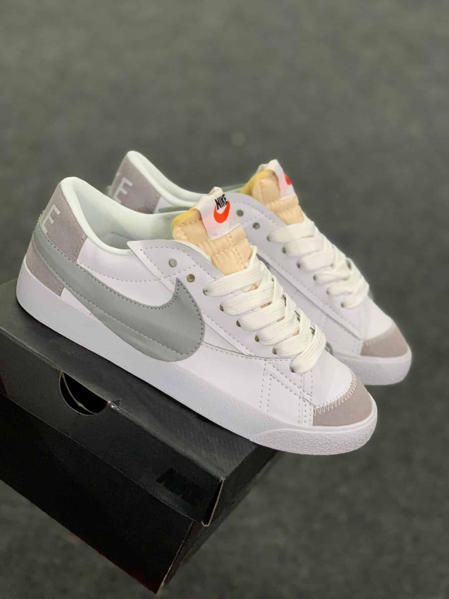 The Blazer Mid 77 Vintage White Sky features a smooth white leather upper with grey suede mudguards and black Swooshes. A white sole and classic branded woven tongue label complete the design.