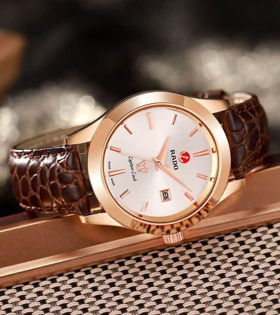 The First Copy Rado Captain Cook 1960’s Purple House New Model is a blend of vintage design and modern features, perfect for formal wear. With a sleek white dial, rose gold case, and brown leather band, this watch combines classic elegance with durability. Featuring quartz movement, sapphire glass, and a functional date display, it’s an ideal accessory for men who appreciate precision and style. A timeless piece that complements any formal occasion.