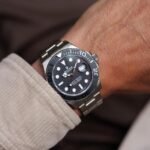 Features: Handcrafted black dial, gold band, quartz movement, and anti-reflective sapphire glass.